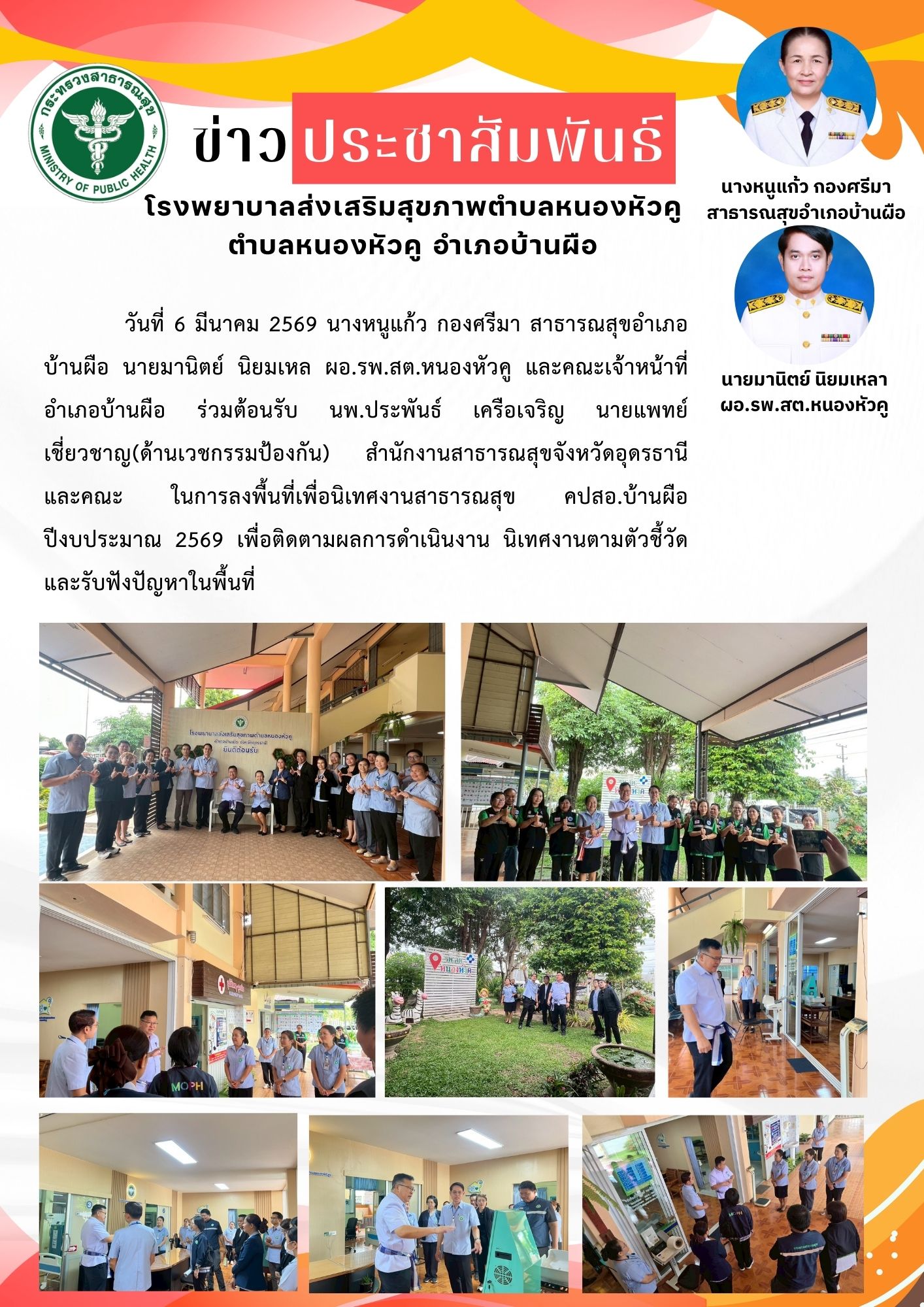 6 มีนาคม 2569 สาธารณสุขอำเภอบ้านผือ ร่วมต้อนรับ นพ.ประพนธ์ เครือเจริญ รอง นพ.สสจ.อุดรธานี ประธานคณะนิเทศงาน คปสอ.สสจ.อุดรธานี ที่ โรงพยาบาลส่งเสริมสุขภาพตำบลหนองหัวคู และร่วมรับฟังการนำเสนอผลการดำเนินงาน คปสอ.ที่ โรงพยาบาลบ้านผือ