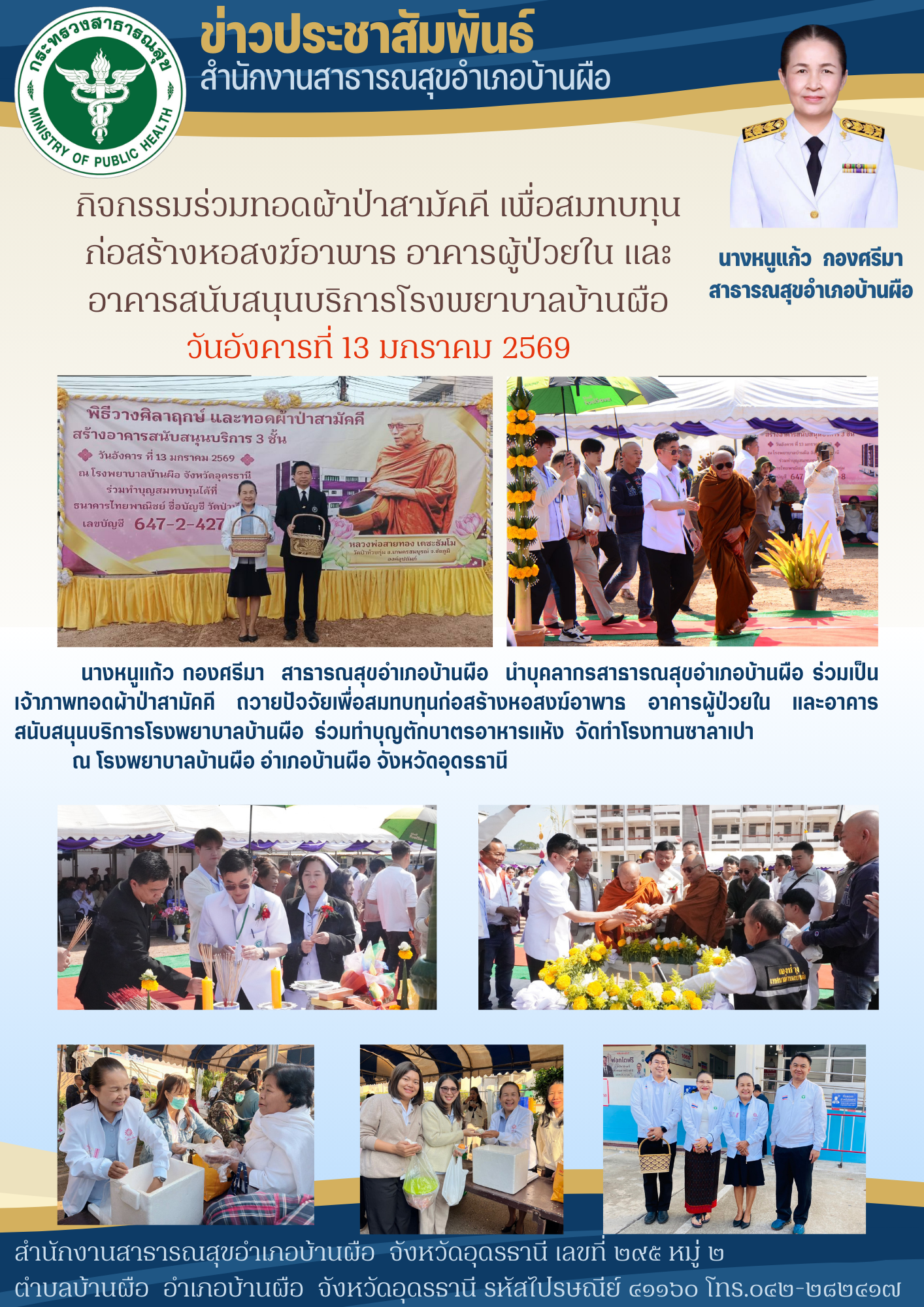 สสอ.บ้านผือ ร่วมพิธีทอดผ้าป่าสามัคคี เพื่อสมทบทุนก่อสร้างหอสงฆ์อาพาธ อาคารผู้ป่วยใน และอาคารสนับสนุนบริการ รพ.บ้านผือ Attachments: FileFile size 13.1.69.png3453 kB