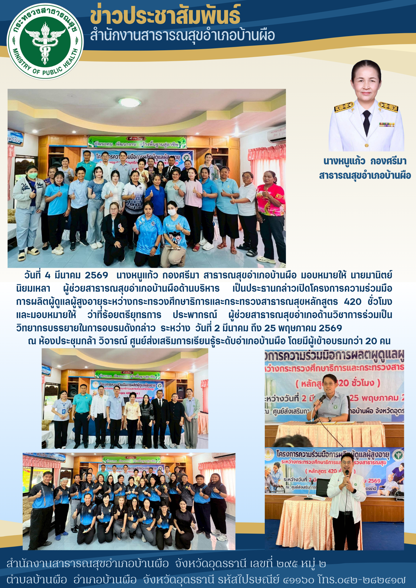 4 มีนาคม 2569 สาธารณสุขอำเภอบ้านผือ มอบหมายนายมานิตย์ นิยมเหลา ผู้ช่วยสาธารณสุขอำเภอ(ด้านบริหาร) เป็นประธานในพิธีเปิดการอบรมโครงการอบรมผู้ดูแลผู้สูงอายุ (หลักสูตร 420 ชั่วโมง) โดยการดำเนินงานของศูนย์ส่งเสริมการเรียนรู้ระดับอำเภอบ้านผือ ณ. ห้องประชุมศูนย์ส่งเสริมการเรียนรู้ระดับอำเภอบ้านผือ